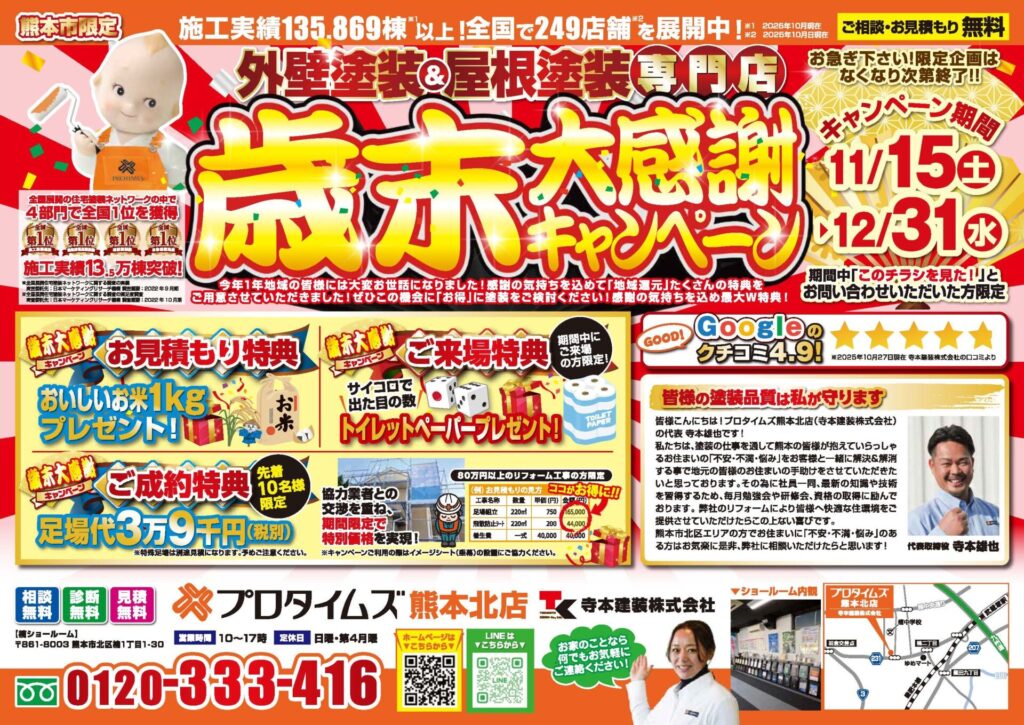熊本市の皆さま、こんにちは。プロタイムズ熊本北店(寺本建装株式会社)の寺本です。