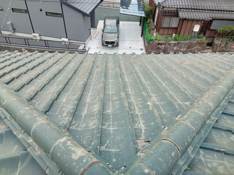 現地を確認したところ、屋根の塗膜は経年劣化でツヤがなくなり、コケや汚れの付着が見られました。