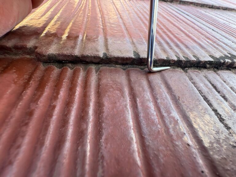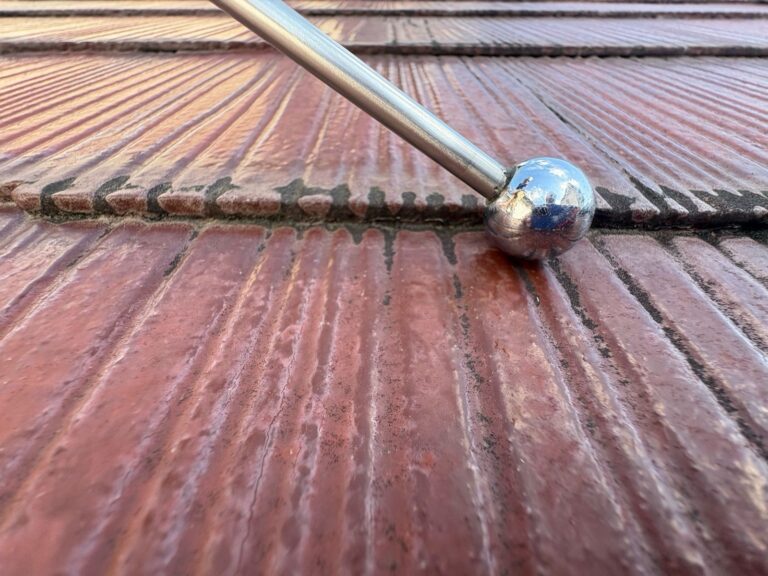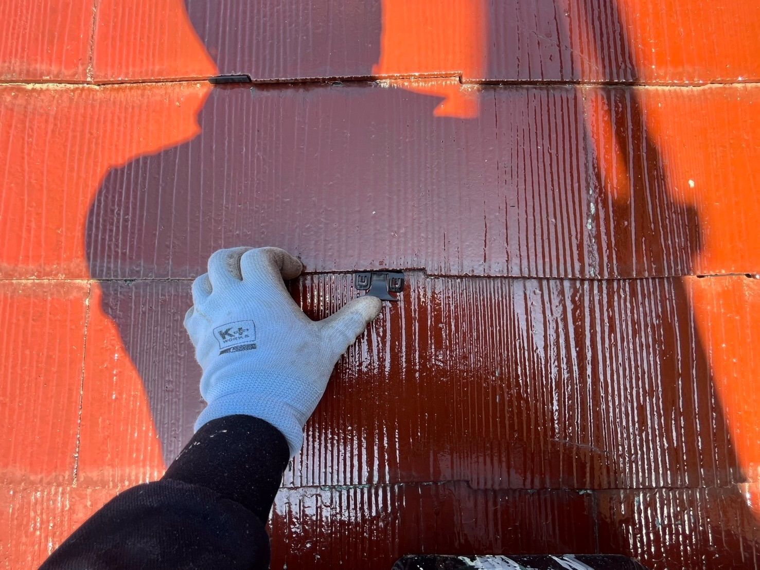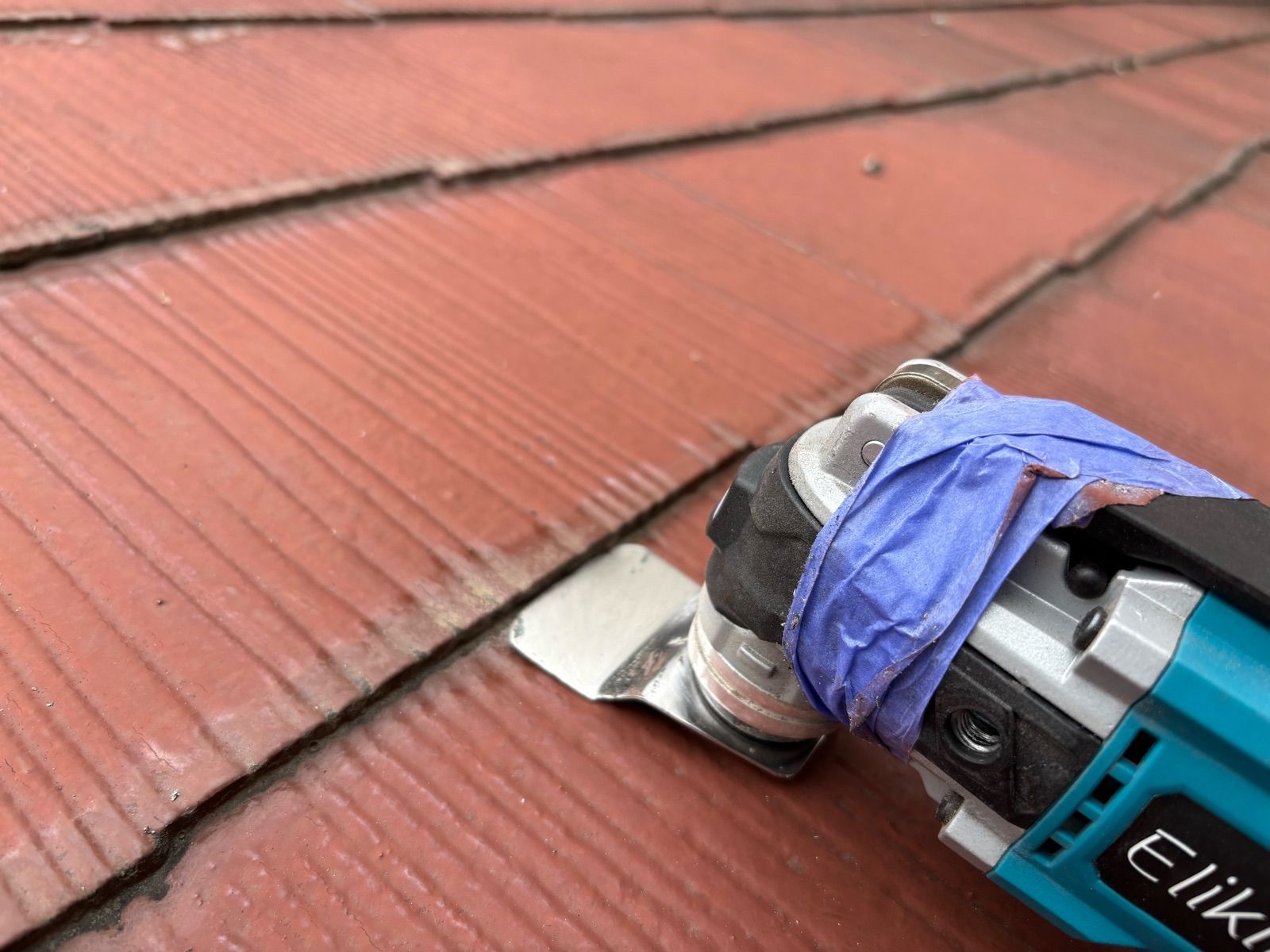 前回の塗装工事ではカラーベスト屋根には大切な【縁切り作業】がされておらず、一部雨漏り被害も出ていましたので今回は塗料で埋まってしまっていた屋根材の重なりを全てマルチツールで切り込み、タスペーサーを差し込み施工しています(`・ω・´)b!!
