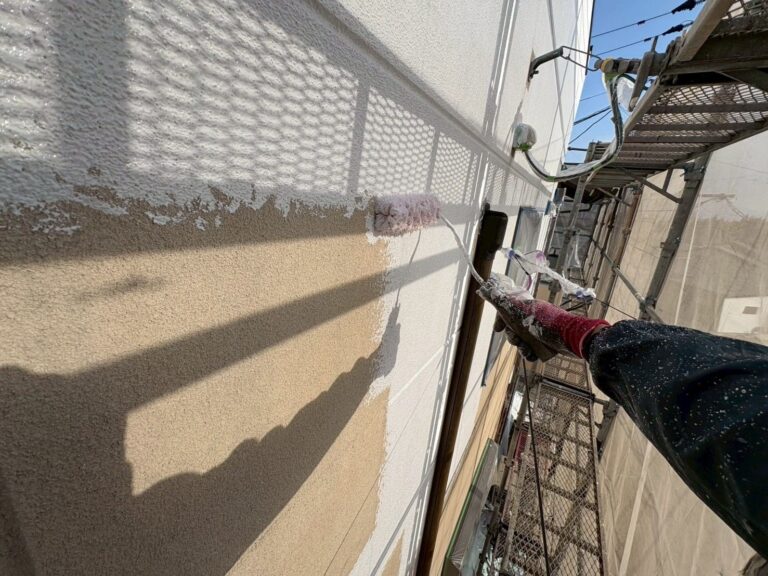 今回の外壁遮熱塗装工事では、スタッコ特有のザラザラした外壁面をなだらかに整えるため、厚みの付く下塗り材を使用し、下地処理から丁寧に施工しました🔧✨