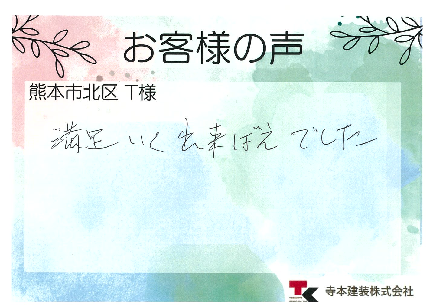 この度は大切なお住まいの工事を寺本建装(プロタイムズ熊本北店)にお任せいただき、誠にありがとうございました。